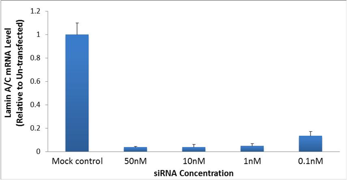 Fig.2. StarvioPM transfection reagent offers high level of gene knockdown with low concentration of siRNA. Lamin A/C siRNA-StarvioPM transfection complexes were prepared in 96-well plates,and then bovine chondrocytes were added to each well.