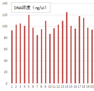 圖.1 20份人外周血樣本使用Starvio血液DNA提取試劑盒提取DNA的濃度(ng/ul)分布,洗脫體積50ul。(儀器型號(hào): Nanodrop2000c)