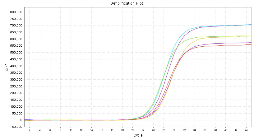 圖.2 Starvio血液DNA提取試劑盒提取6例人外周血中總DNA,檢測(cè)人外周血中GAPDH 基因表達(dá)水平。(儀器型號(hào): ABI7500,人外周血樣本1ml,提取的DNA用50ul洗脫液洗脫下來(lái),取4ul做熒光定量PCR檢測(cè),每例樣本提取后的核酸1次PCR檢測(cè)后的擴(kuò)增曲線(xiàn),CT值在20-23之間。)