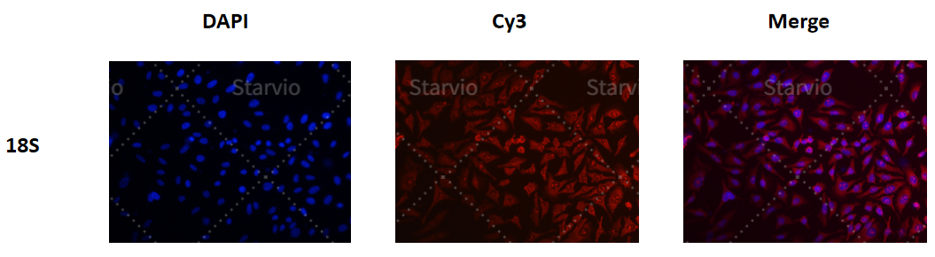 圖1. 使用Biotin-18S RNA探針和Cy3-Avidin,通過Starvio熒光原位雜交試劑盒II進(jìn)行FISH實(shí)驗(yàn)檢測(cè)Hela細(xì)胞中18S rRNA的定位。